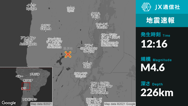 6月25日 12:16頃、アルゼンチンのSan Antonio de los Cobresから西74kmの地点でM4.6の地震がありました。
