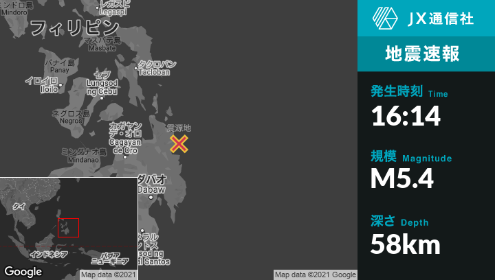 6月27日 16:14頃、フィリピンのBacolodから北東8kmの地点でM5.4の地震がありました。