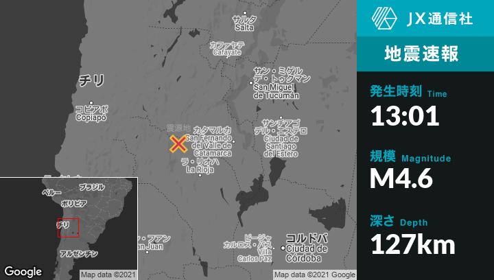 | 震源地 | アルゼンチンのTinogastaから南39kmの地点 |