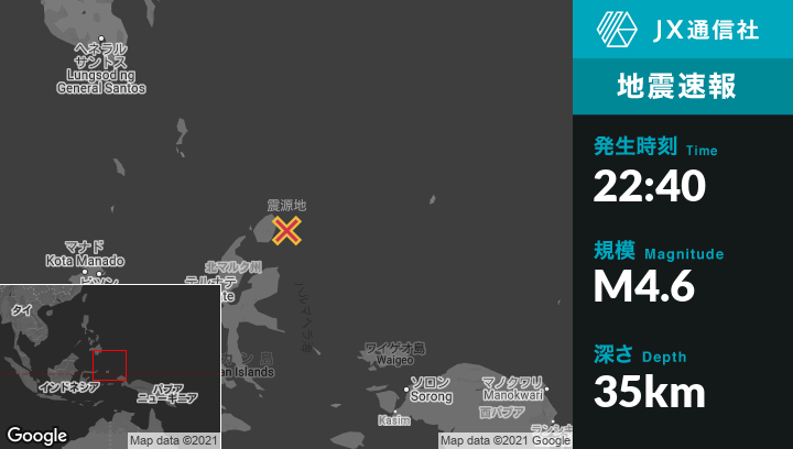 | 震源地 | インドネシアのTobeloから北東121kmの地点 |