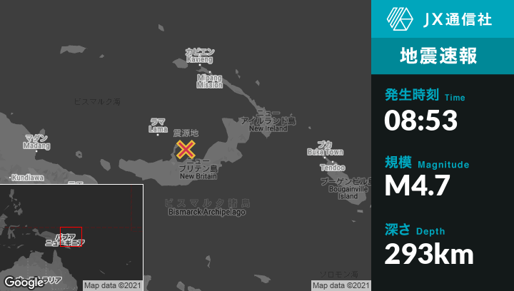7月09日 08:53頃、パプアニューギニアのKimbeから北北東62kmの地点でM4.7の地震がありました。
