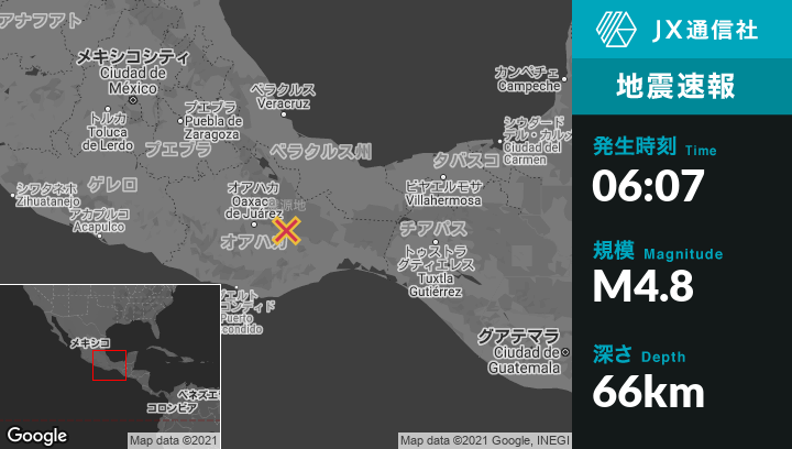 7月10日 06:07頃、メキシコのTlahuitoltepecから南西3kmの地点でM4.8の地震がありました。