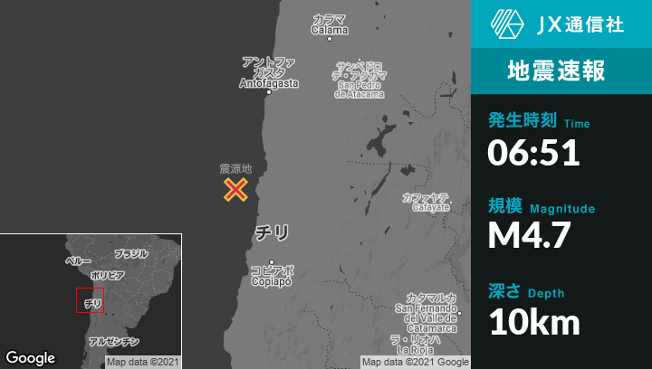 | 震源地 | チリのTaltalから西南西80kmの地点 |