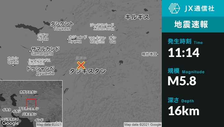 7月10日 11:14頃、タジキスタンのRashtから東南東18kmの地点でM5.8の地震がありました。