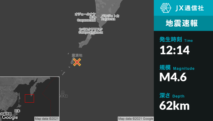 7月10日 12:14頃、ロシアのSevero-Kuril’skから南南西155kmの地点でM4.6の地震がありました。