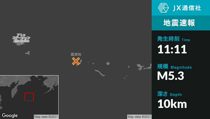 7月11日 11:11頃、アラスカのAttu Stationから東南東285kmの地点でM5.3の地震がありました。