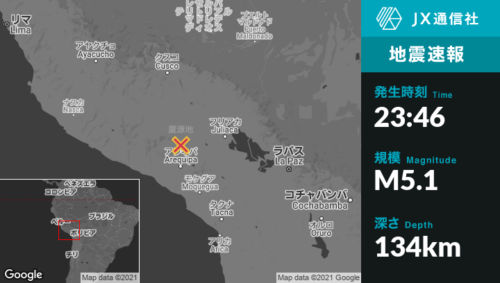 | 震源地 | ペルーのChivayから東5kmの地点 |