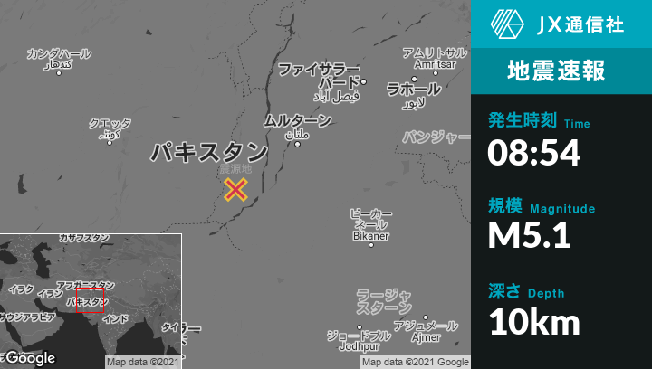7月21日 08:54頃、パキスタンのRajanpurから北西38kmの地点でM5.1の地震がありました。