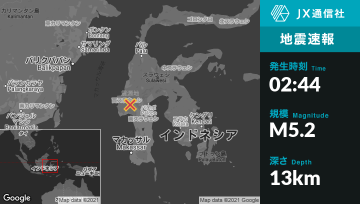 | 震源地 | インドネシアのPolewaliから北56kmの地点 |