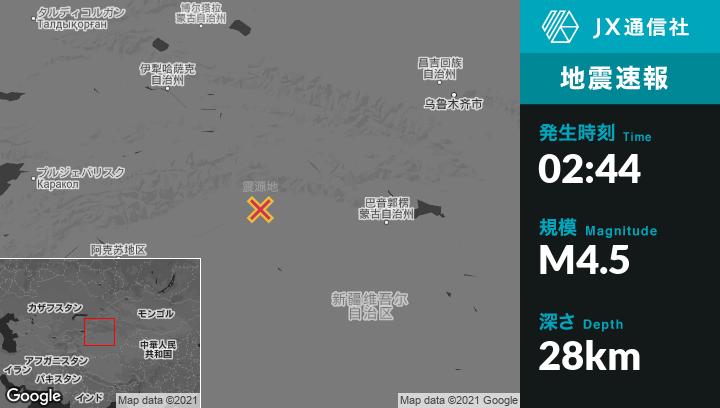 7月24日 02:44頃、中国のKuqaから北東52kmの地点でM4.5の地震がありました。