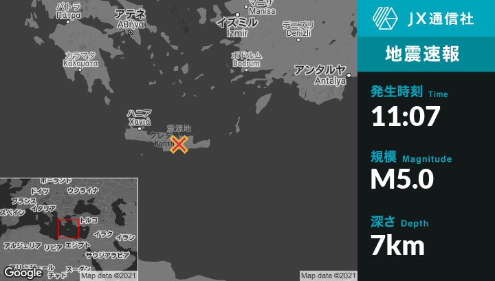 | 震源地 | ギリシャのThrapsanónから北西3kmの地点 |