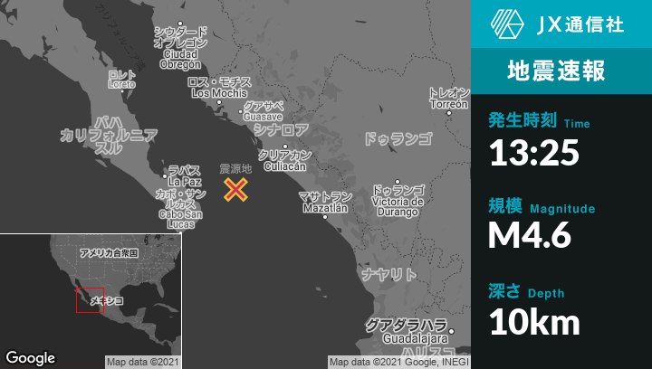 7月25日 13:25頃、メキシコのAltataから南西99kmの地点でM4.6の地震がありました。