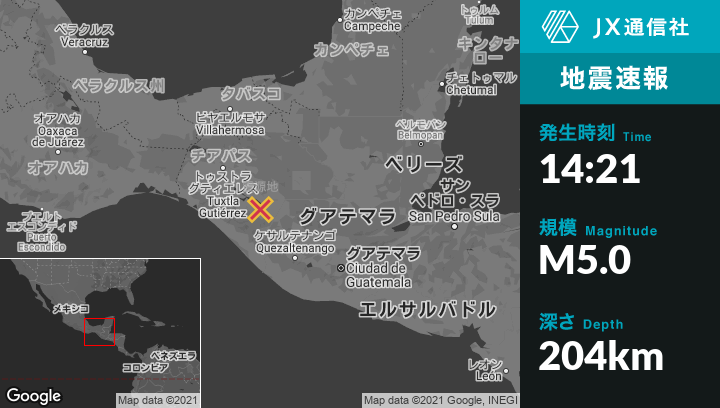 7月25日 14:21頃、メキシコのNueva Américaから北北東6kmの地点でM5.0の地震がありました。