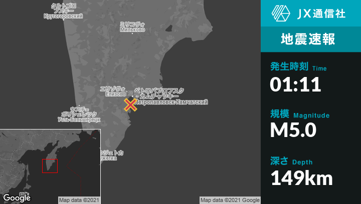 7月27日 01:11頃、ロシアのVilyuchinskから東南東9kmの地点でM5.0の地震がありました。
