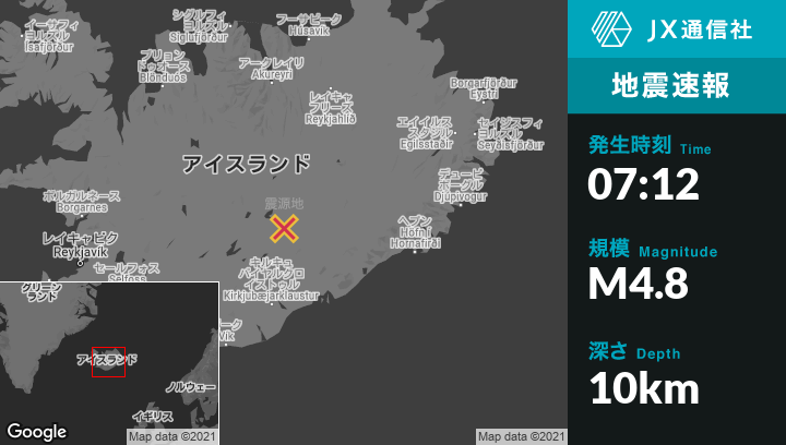 | 震源地 | アイスランドのHöfnから西130kmの地点 |