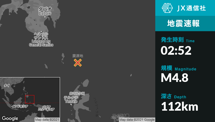 | 震源地 | インドネシアのTobeloから北245kmの地点 |