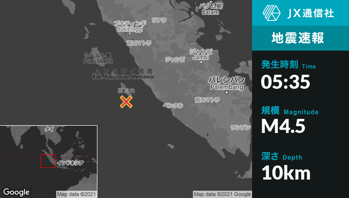 | 震源地 | インドネシアのSungai Penuhから南西188kmの地点 |