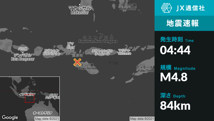 8月04日 04:44頃、インドネシアのKomodoから南南西79kmの地点でM4.8の地震がありました。