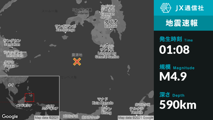 8月07日 01:08頃、フィリピンのTabiauanから南東170kmの地点でM4.9の地震がありました。