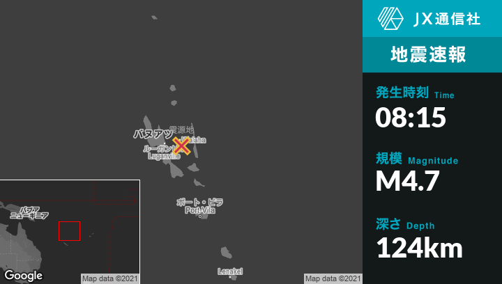 8月07日 08:15頃、バヌアツのLuganvilleから東61kmの地点でM4.7の地震がありました。