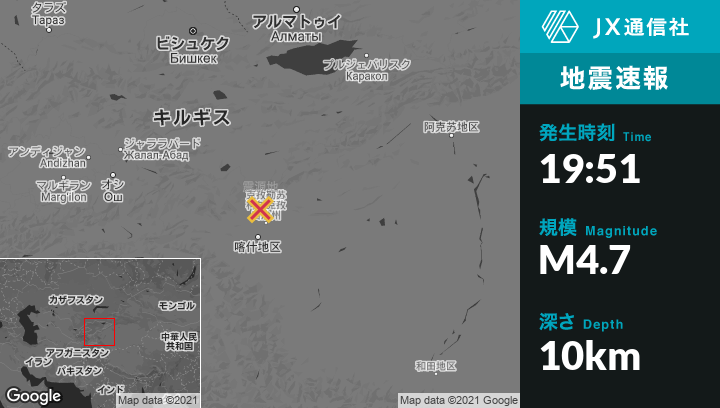 8月09日 19:51頃、中国のKashgarから北62kmの地点でM4.7の地震がありました。