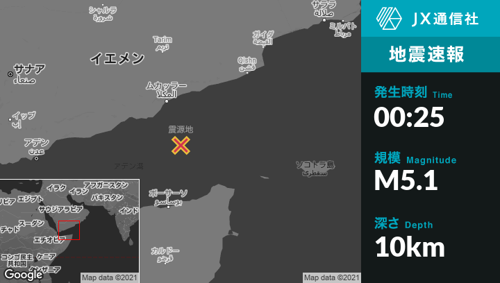 | 震源地 | イエメンのMukallaから南南東145kmの地点 |