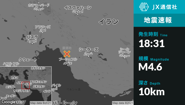 8月13日 18:31頃、イランのBandar-e Genāvehから北東36kmの地点でM4.6の地震がありました。