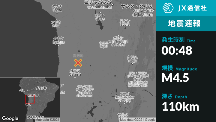 8月16日 00:48頃、チリのCalamaから北126kmの地点でM4.5の地震がありました。