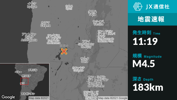 | 震源地 | アルゼンチンのSan Antonio de los Cobresから西98kmの地点 |