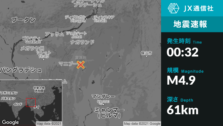 | 震源地 | インドのWāngjingから東北東42kmの地点 |