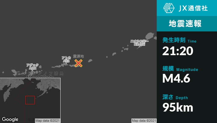 8月20日 21:20頃、アラスカのAtkaから東60kmの地点でM4.6の地震がありました。
