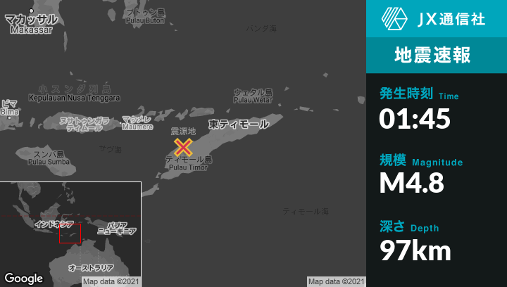 8月21日 01:45頃、東ティモールのPante Makasarから西南西24kmの地点でM4.8の地震がありました。