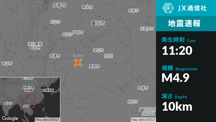 8月21日 11:20頃、中国のBijieから南東19kmの地点でM4.9の地震がありました。