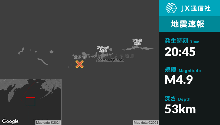 8月22日 20:45頃、アラスカのAdakから西南西126kmの地点でM4.9の地震がありました。