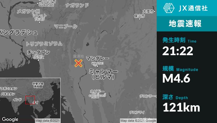 8月22日 21:22頃、ミャンマーのMonywaから西北西47kmの地点でM4.6の地震がありました。