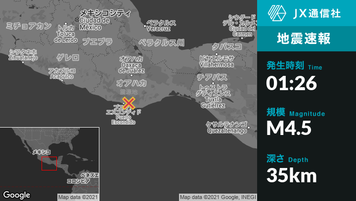 | 震源地 | メキシコのSan Baltazar Loxichaから南西9kmの地点 |
