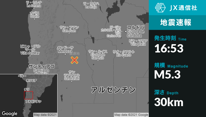 9月29日 16:53頃、アルゼンチンのSan Martínから東南東32kmの地点でM5.3の地震がありました。