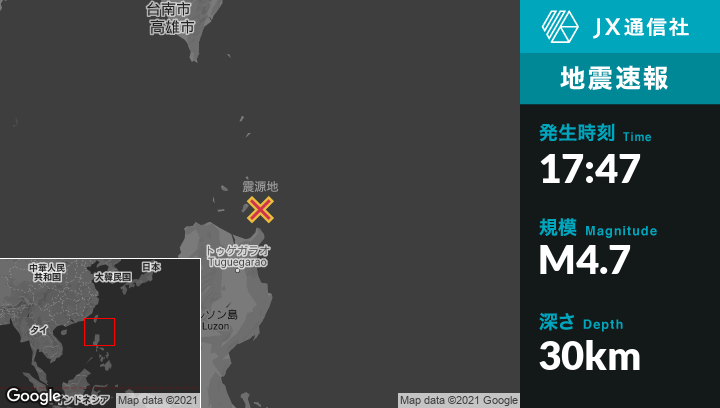 9月30日 17:47頃、フィリピンのSan Vicenteから北54kmの地点でM4.7の地震がありました。