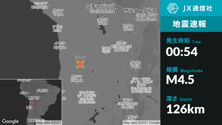 | 震源地 | チリのCalamaから北156kmの地点 |