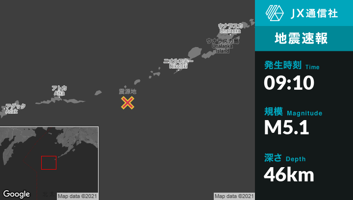 | 震源地 | アラスカのNikolskiから西南西180kmの地点 |