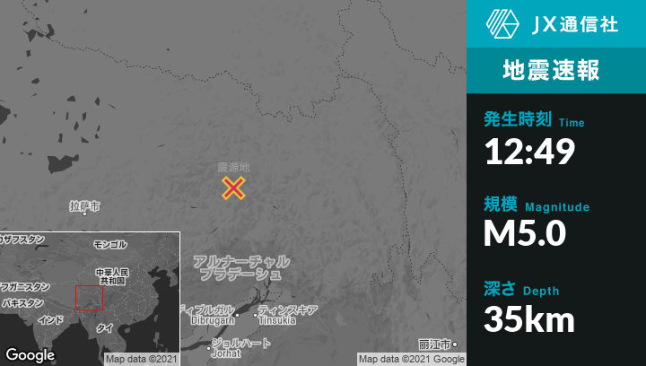10月01日 12:49頃、インドのShi Yomiから北北東201kmの地点でM5.0の地震がありました。