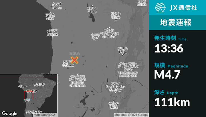 | 震源地 | チリのCalamaから北北東89kmの地点 |