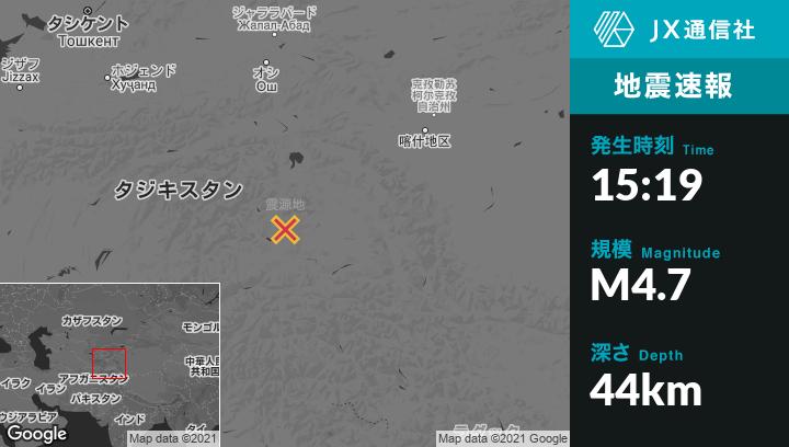 10月03日 15:19頃、タジキスタンのMurghobから西南西70kmの地点でM4.7の地震がありました。