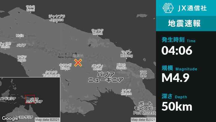 10月05日 04:06頃、パプアニューギニアのTariから西北西93kmの地点でM4.9の地震がありました。