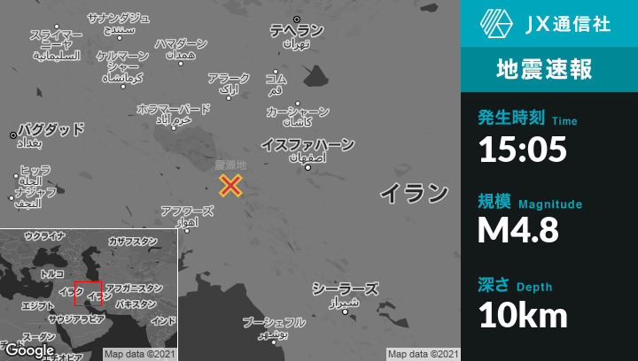 10月09日 15:05頃、イランのMasjed Soleymānから北東64kmの地点でM4.8の地震がありました。