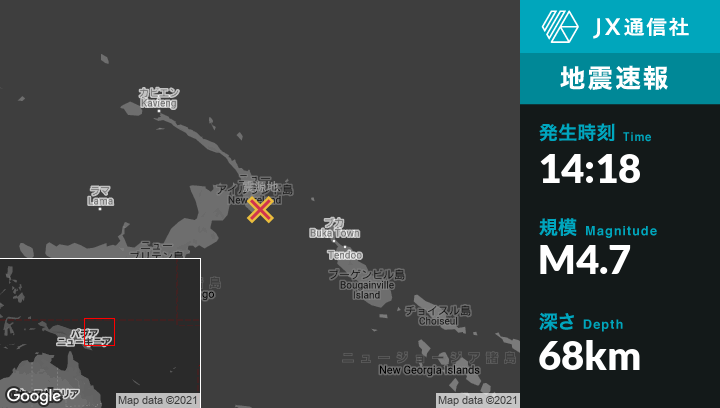 10月17日 14:18頃、パプアニューギニアのKokopoから東南東91kmの地点でM4.7の地震がありました。