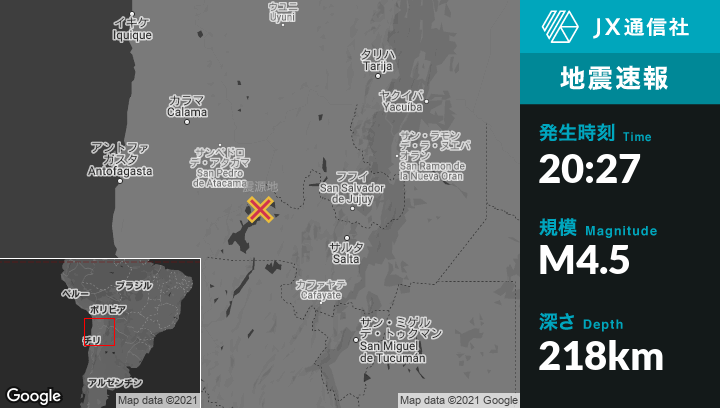 | 震源地 | アルゼンチンのSan Antonio de los Cobresから西103kmの地点 |