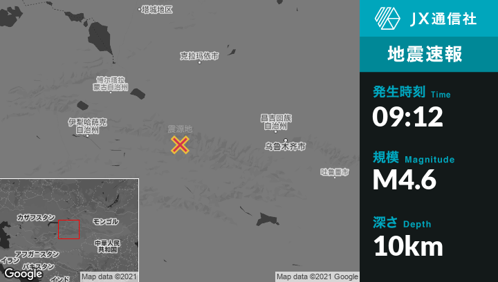 10月21日 09:12頃、中国のXinyuanから東北東92kmの地点でM4.6の地震がありました。