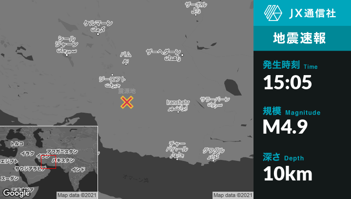 10月21日 15:05頃、イランのMīnābから東北東142kmの地点でM4.9の地震がありました。