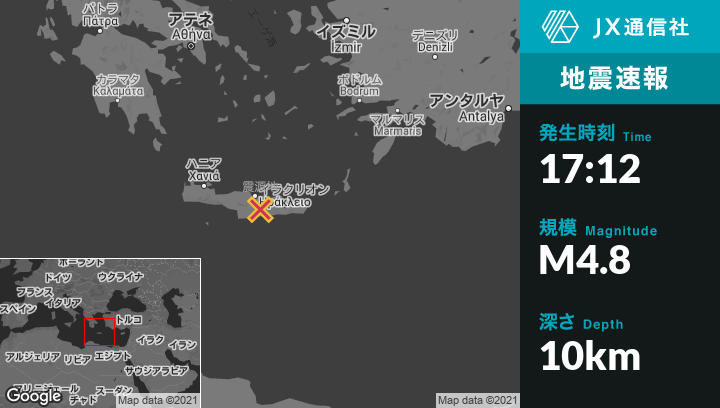 10月21日 17:12頃、ギリシャのThrapsanónから西2kmの地点でM4.8の地震がありました。
